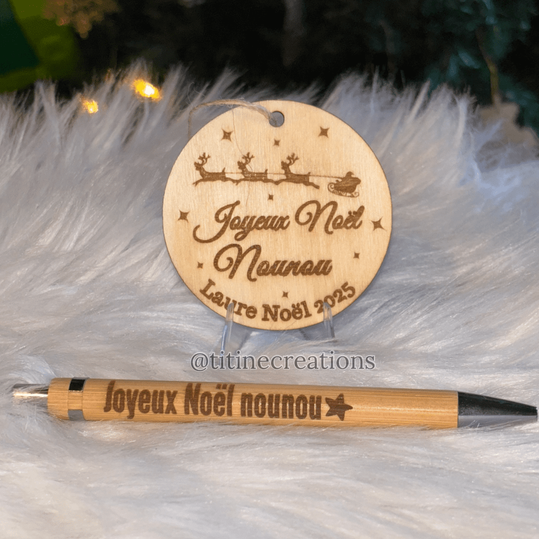 Lot cadeau 🎁 : une boule de Noël en bois et un crayon assorti, personnalisés pour maîtresse, ATSEM, nounou ect… Un présent unique et plein de tendresse pour dire merci et célébrer les fêtes ! 🎄✨