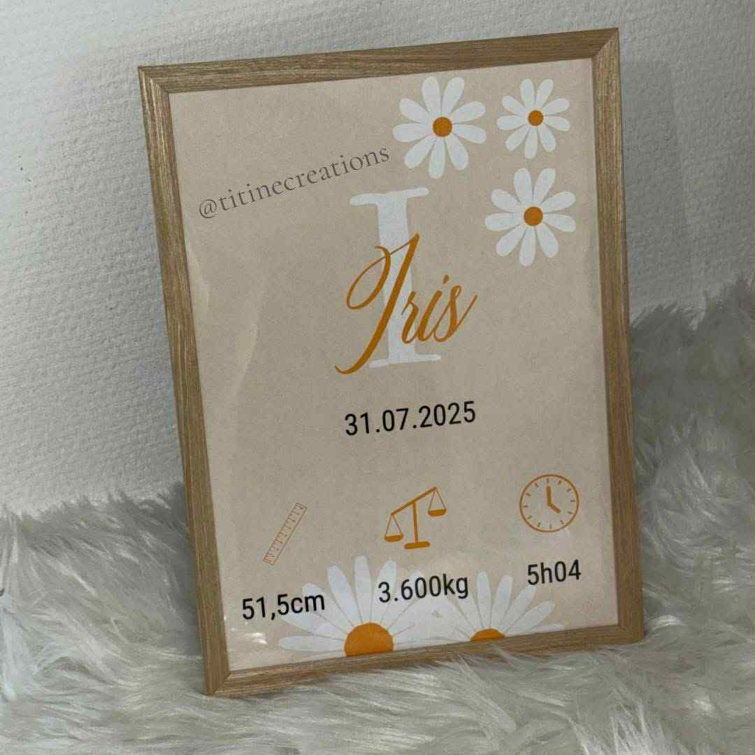 Affiche de naissance personnalisée avec prénom, date, heure, taille et poids 👶 Imprimée sur papier A4 250g (vendue sans cadre). Un souvenir tendre et élégant à offrir ou à encadrer ! ✨