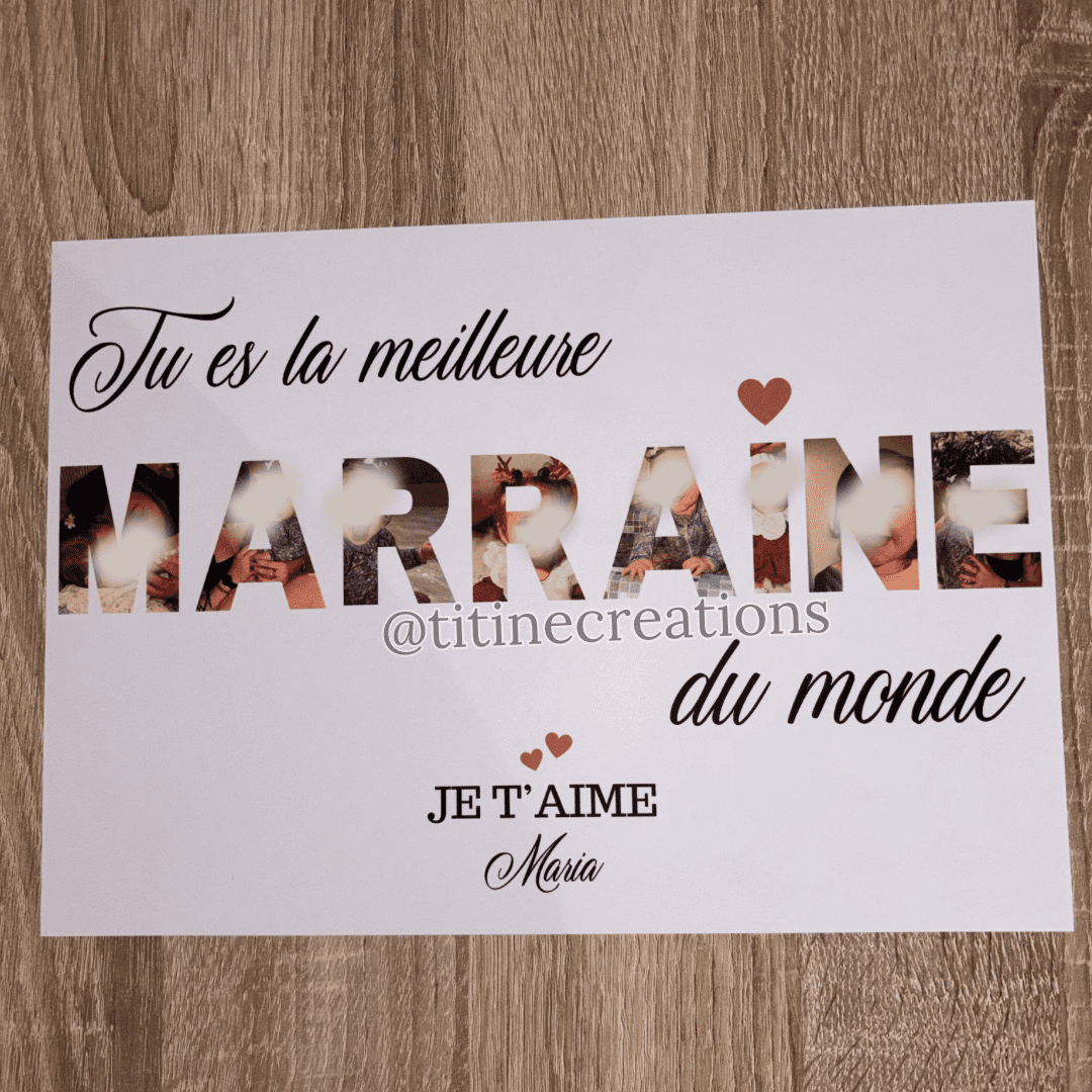 Affiche « Marraine » personnalisée avec 8 photos ❤️ Imprimée sur papier A4 250g (vendue sans cadre). Un cadeau tendre et unique pour mettre en valeur vos plus beaux souvenirs et toucher le cœur de Marraine ! ✨