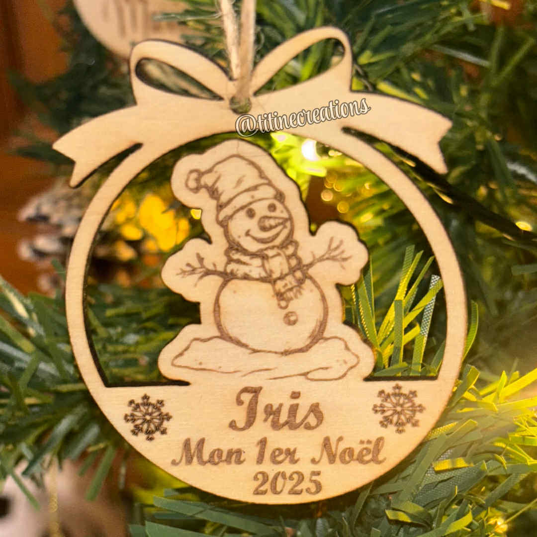 Boule de Noël en bois gravée “Mon premier Noël”, personnalisée avec le prénom et l’année. Un souvenir unique et naturel pour célébrer le premier Noël de bébé. Cadeau idéal pour de jeunes parents !